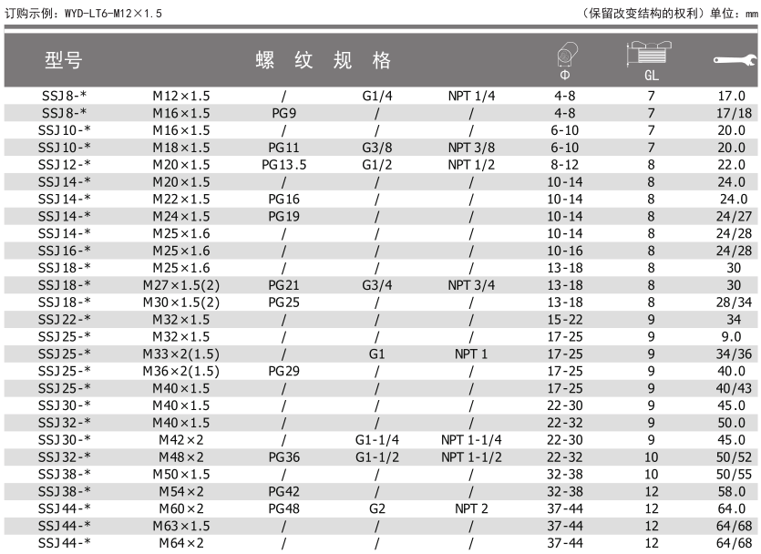 選型介紹:舉例:WYD-SSJ18-M25,"WYD"表示維依德品牌代碼,“SSJ”表示雙鎖緊產(chǎn)品代碼,數(shù)字“18”表示穿過電纜線最大外徑是18毫米,"M25"表示設(shè)備鏈接孔為公制牙M25*1.5.