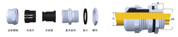 防護等級:在規(guī)定的卡口范圍內(nèi),使用扁平密封圈旋緊迫緊頭,達IP68