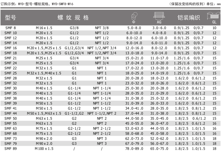 螺牙規(guī)格:公制螺牙(Metric),美制螺牙NPT,英制螺牙G,德制螺牙PG