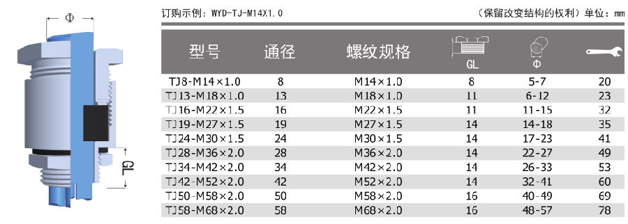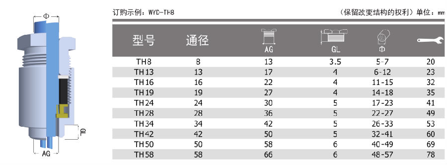維依德船用填料函系列產(chǎn)品,品種齊全、庫存充足,按照材質(zhì)劃分有:鋼材、銅材以及各種合金材料;按照款式有:常用的夾緊式(TJ)、焊接式(TH)以及管式(TG);以及管式(TG);此外還可以擴(kuò)展到鎧裝填料函(防電磁屏蔽)、防爆填料函、梅花式填料函等,種類繁多,運用廣泛,其內(nèi)部橡膠套也可以設(shè)計成多層可剝離式。Wisdom品牌設(shè)計靈活、適應(yīng)電纜外徑變化范圍大,為您的安裝提供了極大的便利,在此粗略列舉幾樣產(chǎn)品,以供參考