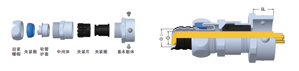 ☆ 產品特性:此款產品既可防電線松動,又可連接金屬軟管和鋼管,裝卸只需拔插無需工具,大大縮減了安裝時間,夾緊電纜范圍大抗拉力特強,產品有耐酸堿、耐化學物質與一般溶劑等抗腐蝕特性,可防水、防塵
